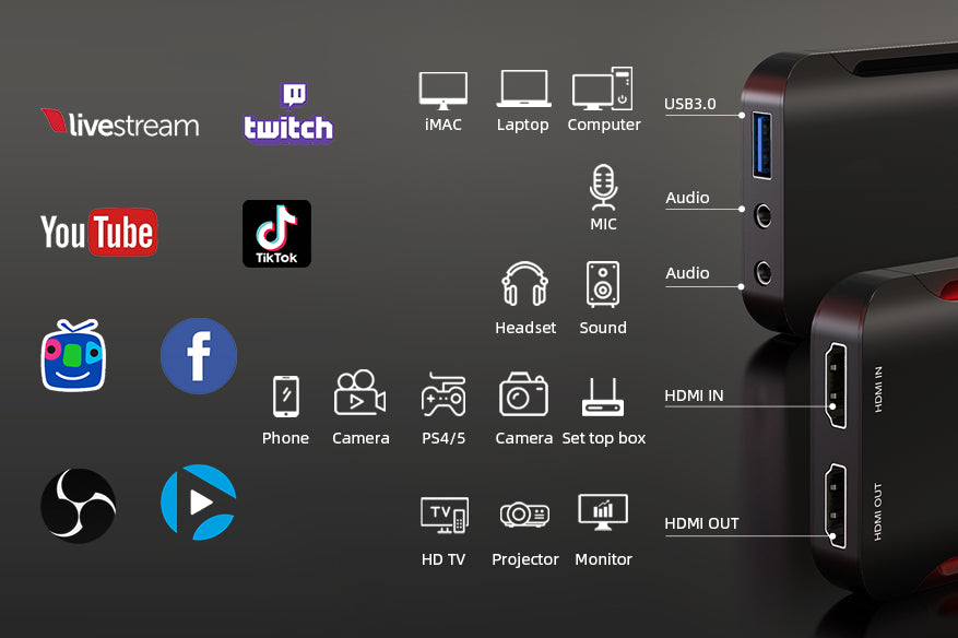 سمات | يدعم مخرج HDMI 1920×1080@60Hz يدعم مدخل صوت الميكروفون، ومخرج ستيريو 3.5. يدعم التقاط صوت الميكروفون وصوت HDMI. يدعم معظم برامج الاستحواذ، مثل VLC، وOBS، وAmcap، وما إلى ذلك. يدعم Windows وAndroid وMacOS. متوافق مع مواصفات فيديو USB UVC ومواصفات صوت USB UAC. |