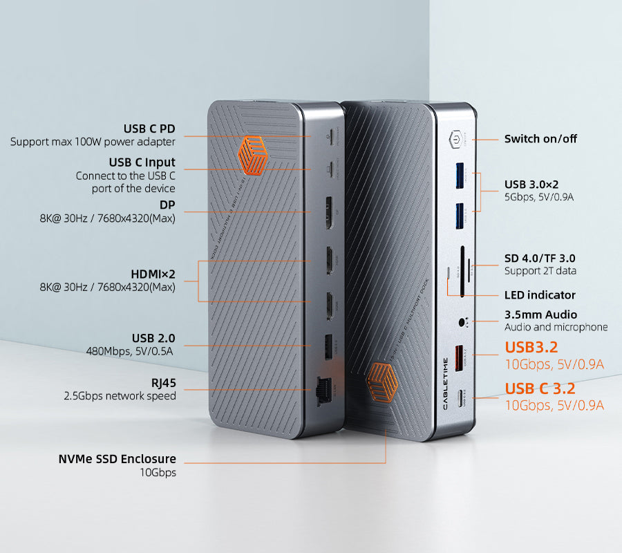Ausgabe | 2×HDMI 8K30Hz 1×DP 8K30Hz (MST) 1×USB-A 3.2 10 Gbit/s 1×USB-C 3.2 10 Gbit/s 2×USB-A 3.0 1×USB-A 2.0 1×SD 4.0 1×TF 3.0 1× NVMe/NGFF SSD 10 Gbit/s 1×USB-C PD 100W 1×LAN 2,5 Gbit/s 1×3,5-mm-Audio |