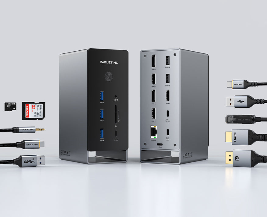 CABLETIME powerful multi-port docking station is designed to meet all your connectivity needs with 18 ports. It includes 1x HDMI 4K60Hz, 2x HDMI 4K60Hz (DL), 2x DP 4K60Hz (DL), 2x USB-C 3.2 10Gbps, 1x USB-A 3.2 10Gbps, 2x USB-A 3.0 5Gbps, and 2x USB-A 2.0 480Mbps. Additionally, it features 1x SD 3.0, 1x TF 3.0 for quick data transfers, 1x LAN 1000Mbps for stable internet, 1x USB-C 100W Power Delivery to charge your laptop, and 1x 3.5mm Audio & Mic jack. This docking station allows you to connect multiple displays and devices, creating a streamlined and highly efficient workstation.