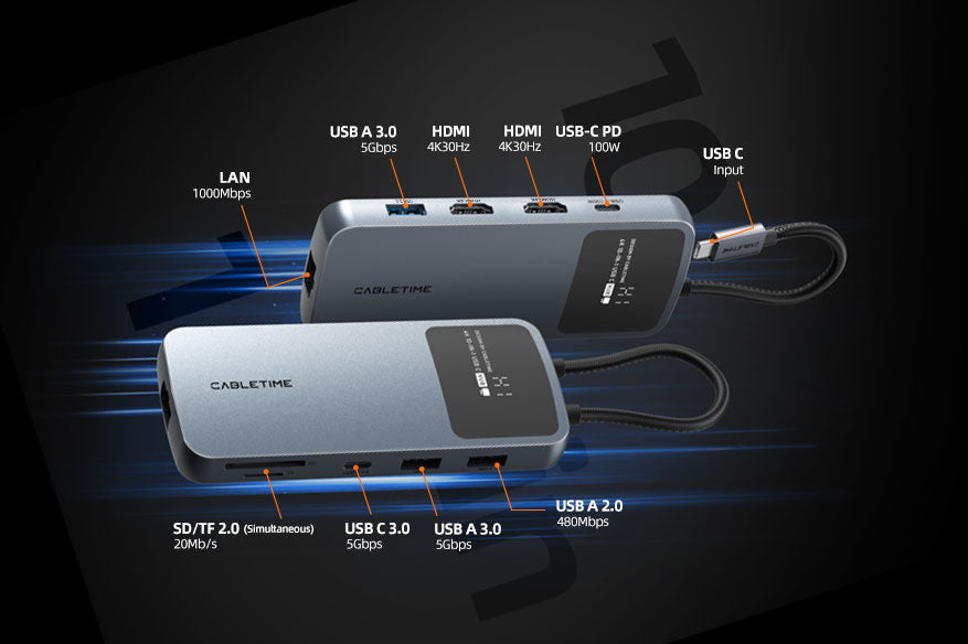 Cabletime's 10 in 1 Dual HDMI USB C Docking Station is a one-stop connection shop for your workspace. It has two HDMI ports capable of 4K 30Hz output for ultra-high definition dual displays. Meanwhile, two USB-A 3.0 and one USB-C 3.0 port provide fast 5Gbps transfers, while an additional USB-A 2.0 can handle more peripherals. A dual SD/TF card reader provides convenient access to storage, a USB-C PD port powers devices with 100W of power, and a LAN port provides fast 1000Mbps wired internet.