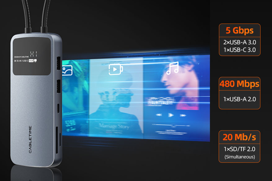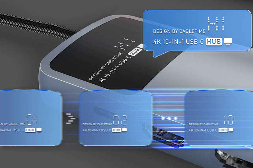CABLETIME 10 IN 1 USB C Dual HDMI Docking Station helps you get the most out of your laptop with its expansive selection of ports, transforming your laptop into a powerful dual-monitor workstation. Connect up to two 4K HDMI displays, two USB-A 3.0 5Gbps ports, one USB-C 3.0 5Gbps port, one USB-A 2.0 port, an SD/TF 2.0 port, a USB-C PD 100W port, and a LAN 1000Mbps port. Plus, it'll give you a friendly 'Hi' when you start to use it, and its digital screen will display the numbers of using ports. Enjoy reliable productivity with this user-friendly docking station.