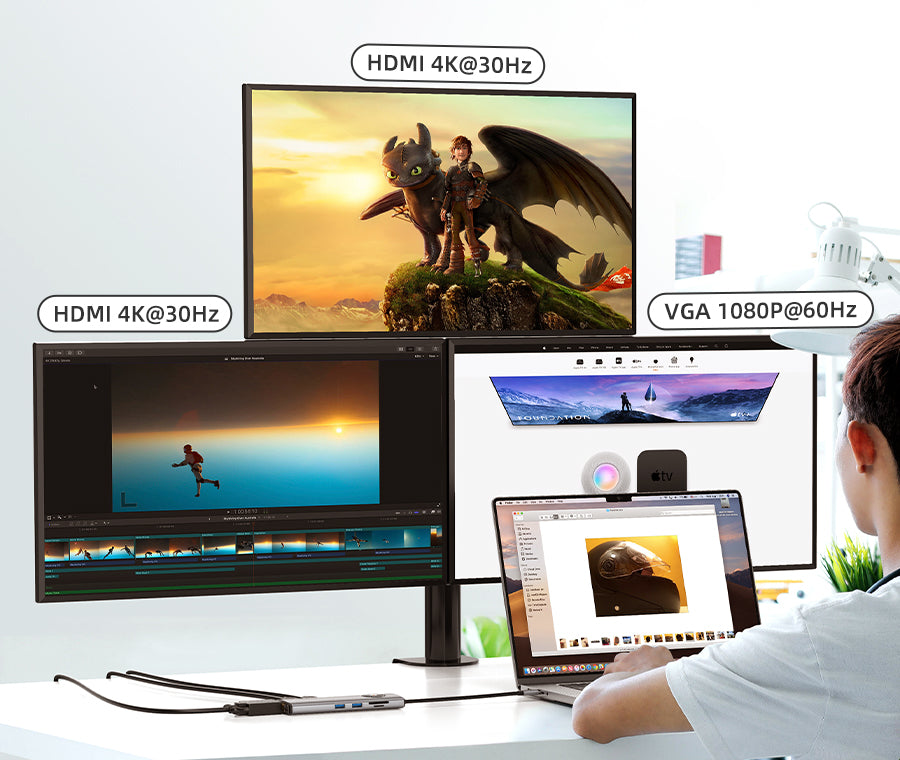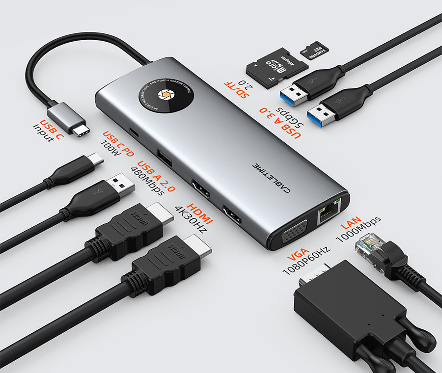Producción | 2×HDMI 4K30Hz 1 VGA 1080P60Hz 2×USB-A 3.0 de 5 Gbps 1×USB-A 2.0 480Mbps 1 tarjeta SD/TF 3.0 1×USB-C PD 100W 1 LAN 1000 Mbps |