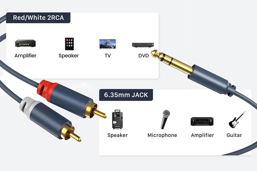 This 1/4-inch male to dual RCA male is compatible with a wide range of devices. The 6.35mm stereo jack provides a secure, stable connection to your guitars, keyboards, mixers, amplifiers, speakers and more. The dual RCA connectors make it easy to connect to amplifiers, speakers, TVs, DVDs, and other audio equipment. Plus, its generous 15m length gives you plenty of room to move around and connect to all your gear.