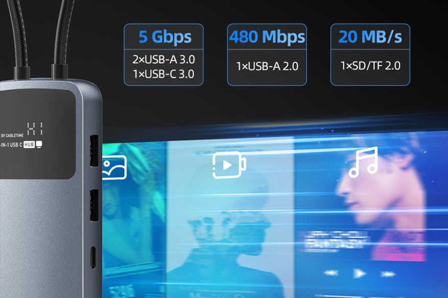 Output | 1×HDMI 4K60Hz 2×USB-A 3.0 5Gbps 1×USB-C 3.0 5Gbps 1×USB-A 2.0 1×SD/TF 2.0 1×USB-C PD 100W 1×LAN 1000Mbps 1×Audio&Mic 3.5mm |