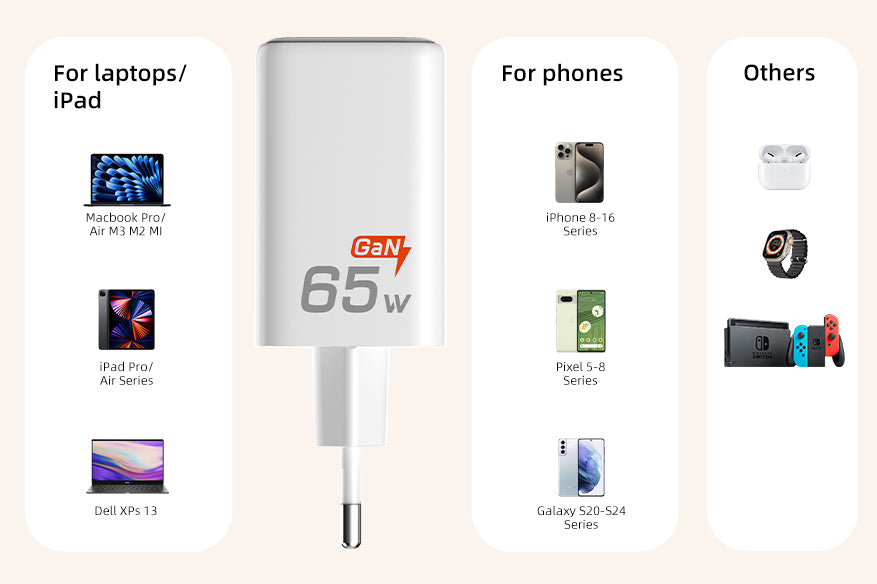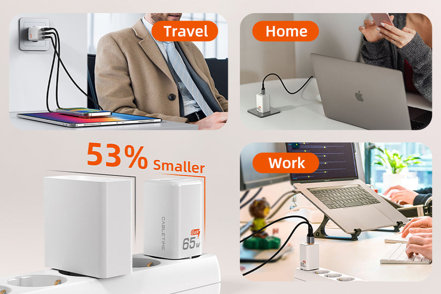 The 65W charger provides flexible power distribution across single, dual, and three-port charging, adapting to your devices’ needs.