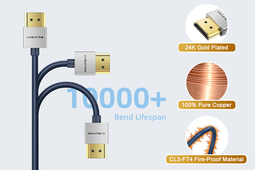 Thinner than ordinary HDMI cords, but can be bent 10,000 times without reducing the flexibility of the cable to withstand daily use.