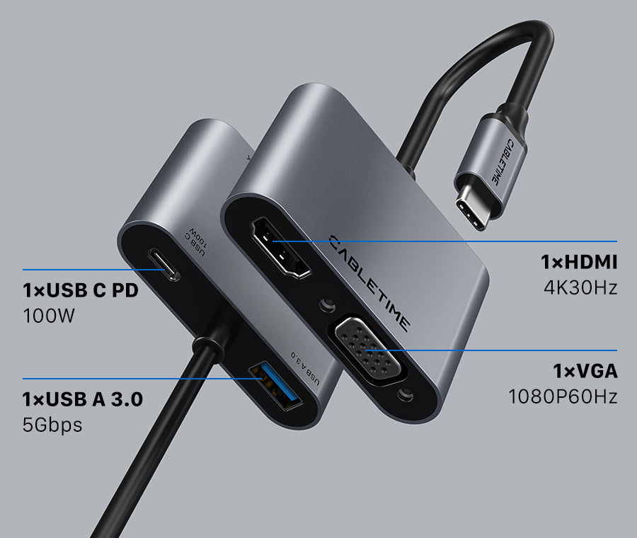 Output | 1×HDMI 4K30Hz, 1×VGA HD60Hz, 1×USB-A 3.0 5Gbps, 1×USB-C PD 100W |