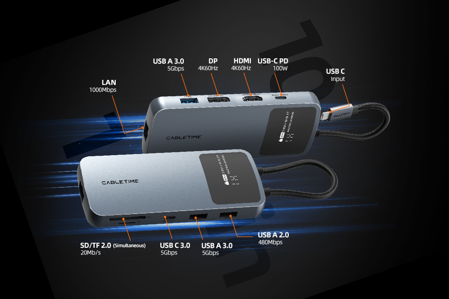 Saída | 1×HDMI 4K60Hz, 1×DP 4K60Hz, 2×USB-A 3.0 5Gbps, 1×USB-C 3.0 5Gbps, 1×USB-A 2.0, 1×SD/TF 2.0, 1×USB-C PD 100W, 1×LAN 1000Mbps |